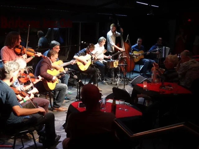 Django Reinhardt, its founder from way back in the 1930s, was from the Manouche clan of French travellers. Sitting around a fire with guitar, violins and maybe the odd accordion, they created a new jazz style that had no piano or drums, but ‘hot’ guitar with percussive rhythm.